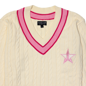Designed with pink collegiate stripes. our Varsity Sweater in ‘Cream’ is the perfect go-to uniform for your back to school era. Not in school? No problem! This sweater is also great for casual outings. walking your dog or a day at the office.?