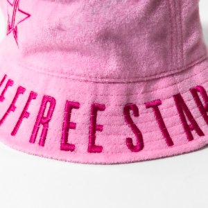 A cute and stylish bucket hat featuring premium embroidered details. Front facing Jeffree Star Cosmetics logo and Jeffree Star embroidered on the brim of the hat. One size